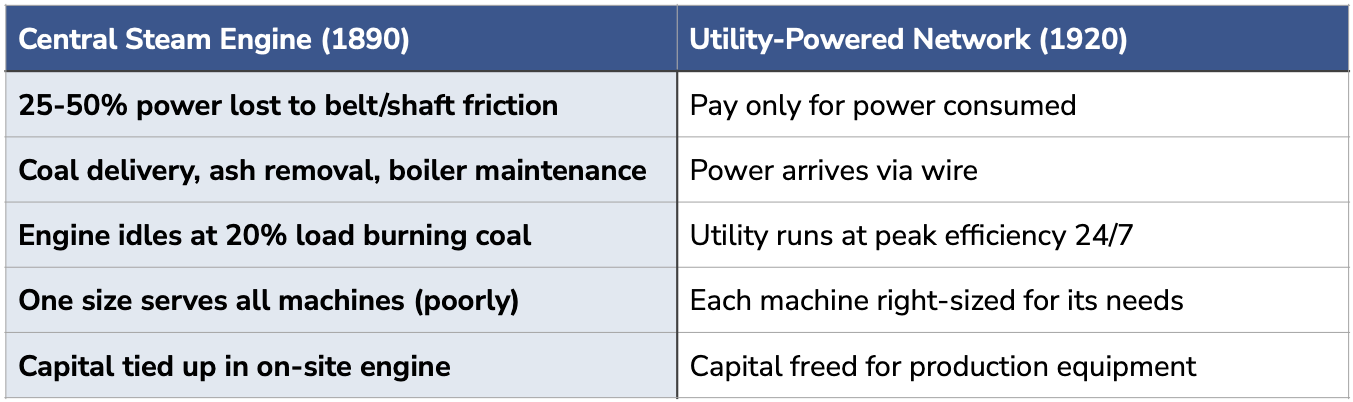 A factory’s 50hp steam engine might idle at 20% load most of the day, burning coal just to stay warm.6 A utility’s 500hp engine runs near peak efficiency 24/7, and the factory only pays for the electrons it actually uses.