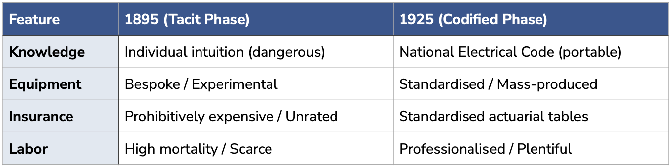 This transformation is what made internal electrical power distribution economically viable. In 1895, deploying internal distribution required hiring scarce electricians with hard-won tacit knowledge, paying premium prices for their expertise, and accepting high failure risk because best practices hadn’t been discovered yet. By 1920, you could hire code-trained electricians at standard rates, buy standardised equipment, follow published standards, and get affordable insurance—because the knowledge had been systematised and made public.